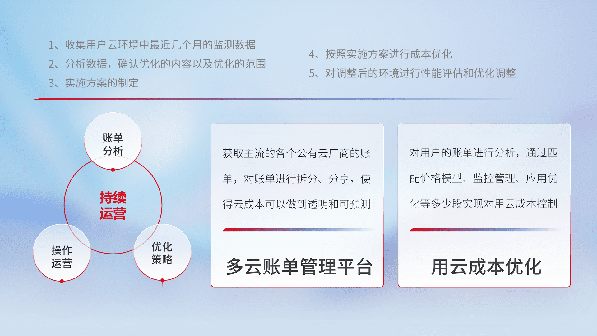 通过灵活运用多种自动化迁移工具,,,帮助企业用户实现业务和数据高效 、、稳定的上云迁移和云上迁移,,,,采用自研多云纳管平台,,,,以中立管理模式,,,解决多组织、、、多云、、、多运维厂商的复杂关系的管理,,保证多云平台资源配置的一致性,,,实时掌控云资源运行数据,,运用智能化工具分析云资源多云平台的管理服务,,透明化管理成本支出,,用云成本可预测、、、、用云费用可优化、、云资源配额有据可依。。。